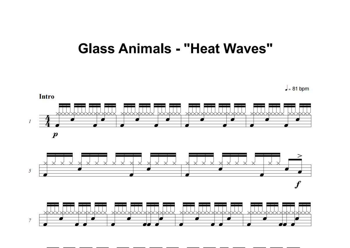 《Heat Waves》是Glass Animals演唱的一首歌曲,这份架子鼓谱共有三张高清图谱,图谱由 @积极处世 编配上传,图谱使用五线谱编配,使用这份Heat Waves架子鼓谱,你将能够轻松地敲打出这首Glass Animals的Heat Waves,快来尝试吧。