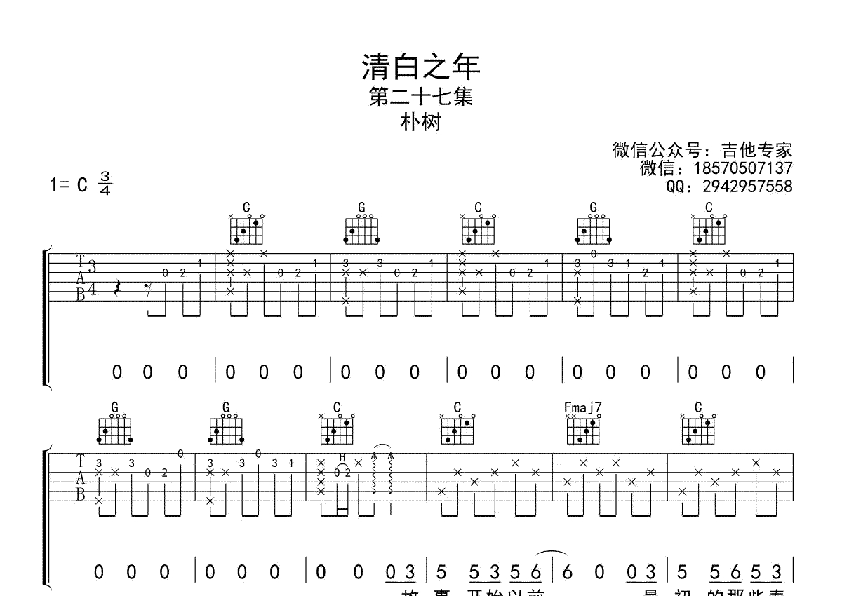 《清白之年》是朴树演唱的一首歌曲,本吉他谱采用的是C调指法编配,这份吉他谱共有四张高清图谱,图谱由 @吉他专家 编配上传,图谱使用六线谱编配,包含吉他和弦指法、简谱以及歌词部分,使用这份清白之年吉他谱,可以让你更加方便地掌握这首歌曲的弹唱技巧,快来尝试吧。清白之年吉他谱,C调指法编配,朴树演唱《清白之年》吉他弹唱谱,带着些许世俗的悲欢,不再清冷如月球上的少年。朴树缓缓走来,故事开始以前,最初的那些春天。那些似是而非,发生过的事都这样,在不经意间悄悄溜走。清白之年,也与我们再无关联。