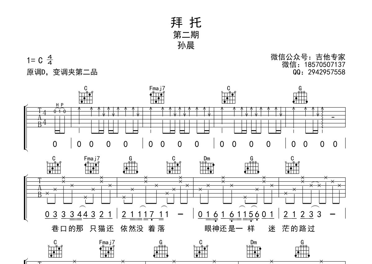 《拜托》是孙晨演唱的一首歌曲,本吉他谱采用的是C调指法编配,这份吉他谱共有两张高清图谱,图谱由 @吉他专家 编配上传,图谱使用六线谱编配,包含吉他和弦指法、简谱以及歌词部分,曲谱配备了相关的视频提供浏览,使用这份拜托吉他谱,可以让你更加方便地掌握这首歌曲的弹唱技巧,快来尝试吧。拜托吉他谱,孙晨演唱的一首好听的网络歌曲,拜托六线谱,高清弹唱图片谱,歌曲原调D,选用C调指法,变调夹夹第二品。老师在编配的时候也做得比较简单,大家弹唱的时候找到自己舒服的调。如果自己不能给她最好的,就放手让她去找更好的。把无情留给了自己,对她却最是深情。来生做春风,流浪又自由。年轻的时代,就连伤春悲秋都显得那么的回味悠长……。
