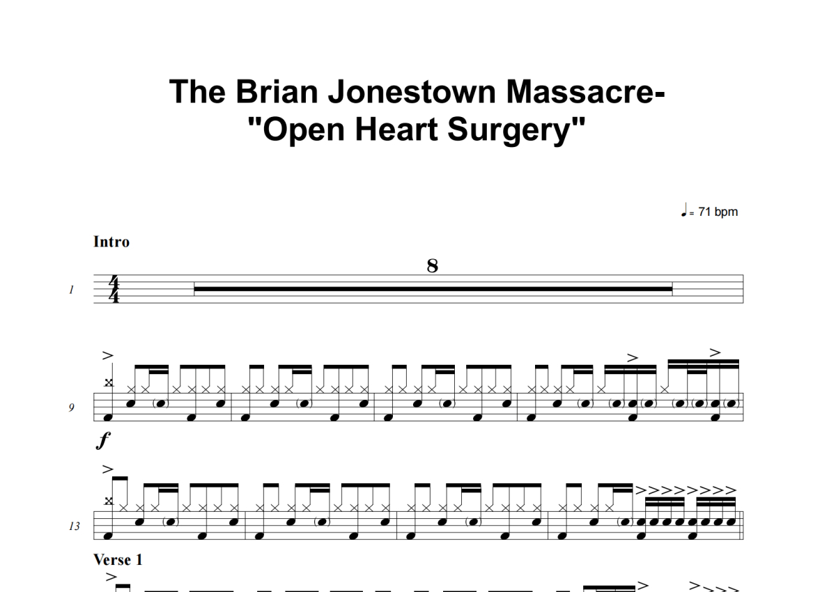 《Open Heart Surgery》是The Brian Jonestown Massacre演唱的一首歌曲,这份架子鼓谱共有三张高清图谱,图谱由 @积极处世 编配上传,图谱使用五线谱编配,使用这份Open Heart Surgery架子鼓谱,你将能够轻松地敲打出这首The Brian Jonestown Massacre的Open Heart Surgery,快来尝试吧。