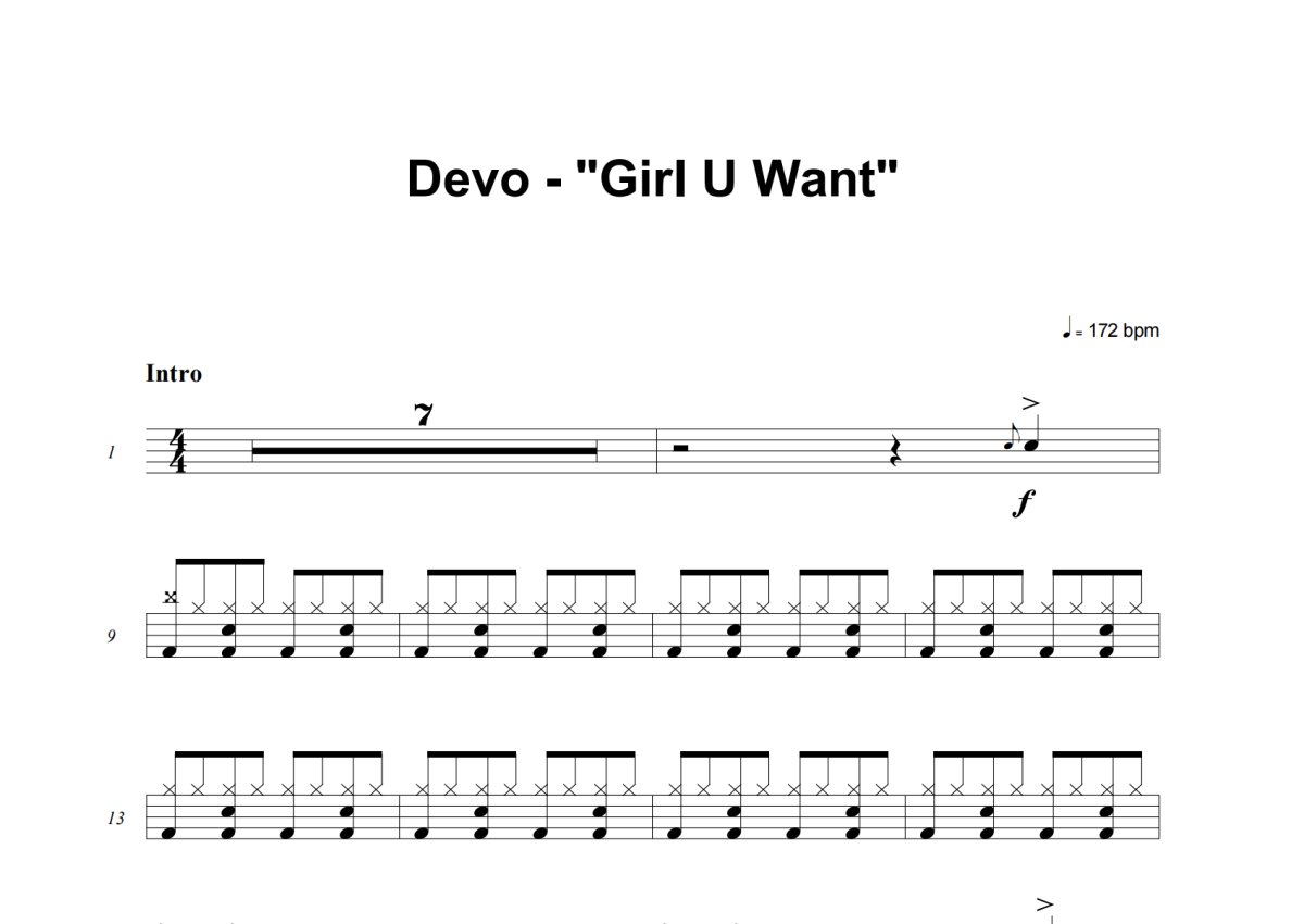 《Girl U Want》是Devo演唱的一首歌曲,这份架子鼓谱共有四张高清图谱,图谱由 @积极处世 编配上传,图谱使用五线谱编配,使用这份Girl U Want架子鼓谱,你将能够轻松地敲打出这首Devo的Girl U Want,快来尝试吧。