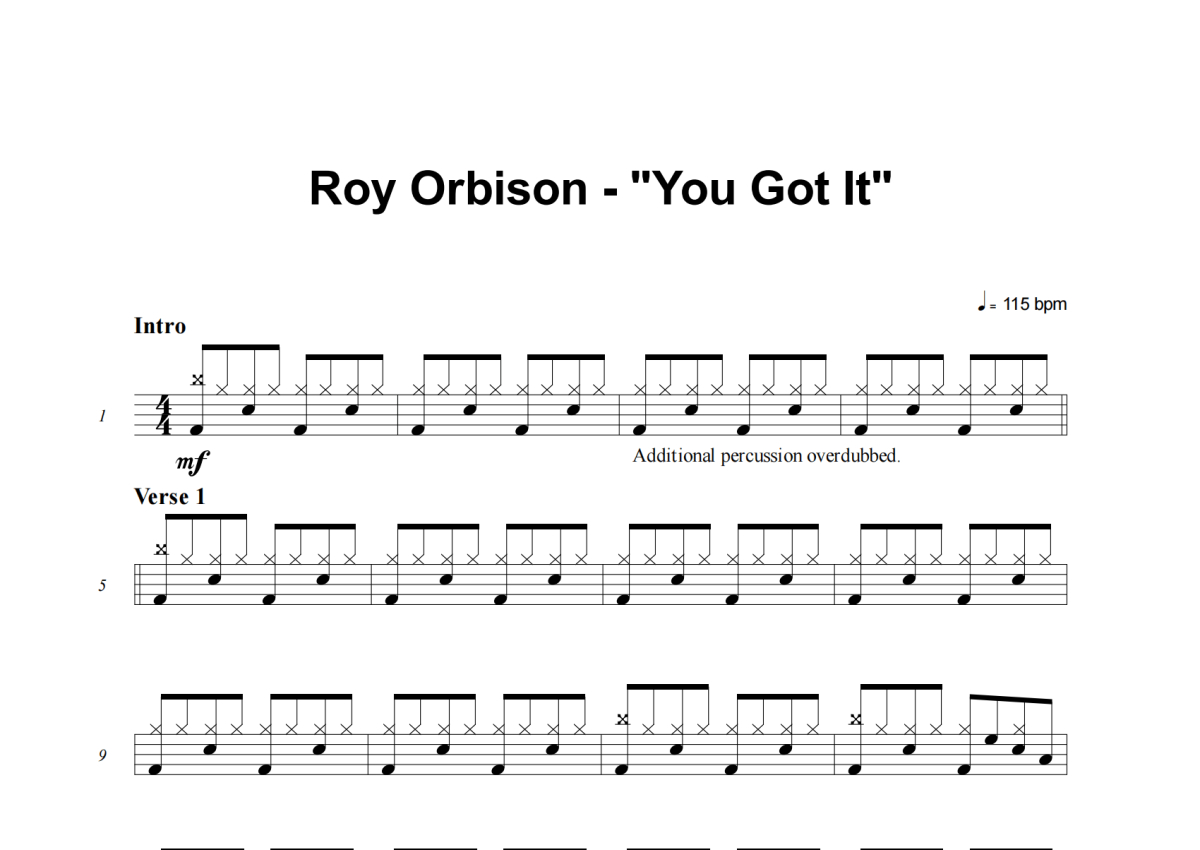 《You Got It》是Roy Orbison演唱的一首歌曲,这份架子鼓谱共有三张高清图谱,图谱由 @积极处世 编配上传,图谱使用五线谱编配,使用这份You Got It架子鼓谱,你将能够轻松地敲打出这首Roy Orbison的You Got It,快来尝试吧。
