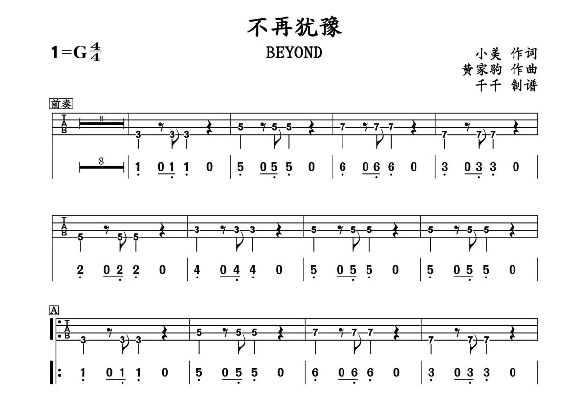 《不再犹豫》是BEYOND演唱的一首歌曲,贝斯谱,拍号为4/4拍,歌曲原调为G调,演奏时不需要使用变调夹即为原调,这份电吉他谱共有两张高清图谱,图谱由 @千千 编配上传,图谱使用六线谱编配,使用这份不再犹豫电吉他谱,可以让你更加方便地掌握这首歌曲的演奏技巧,快来尝试吧。贝斯谱。