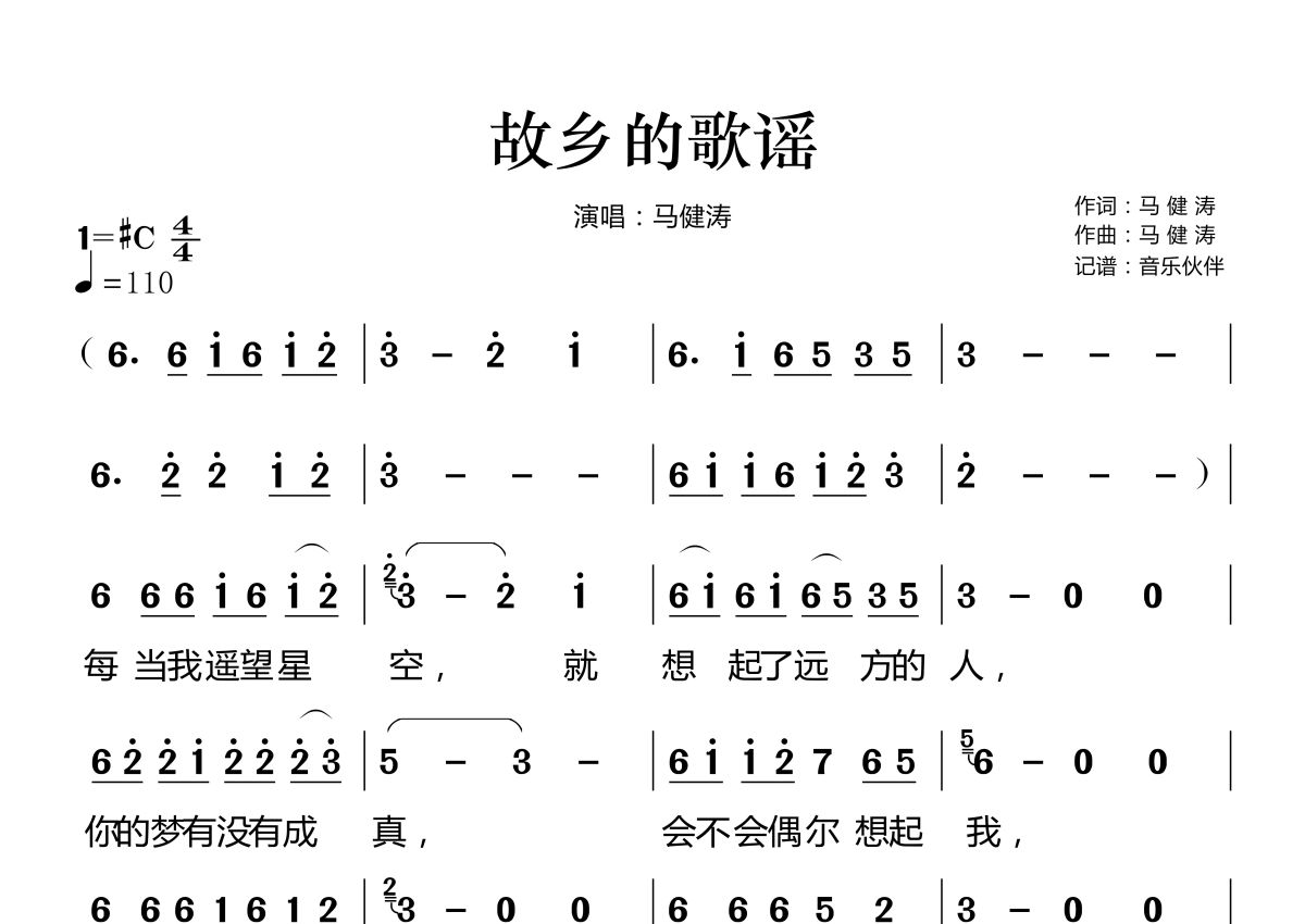 《故乡的歌谣》是马健涛演唱的一首歌曲,拍号为4/4拍,歌曲速度为每分钟110拍,这份简谱共有两张高清图谱,图谱由 @音乐伙伴 编配上传。