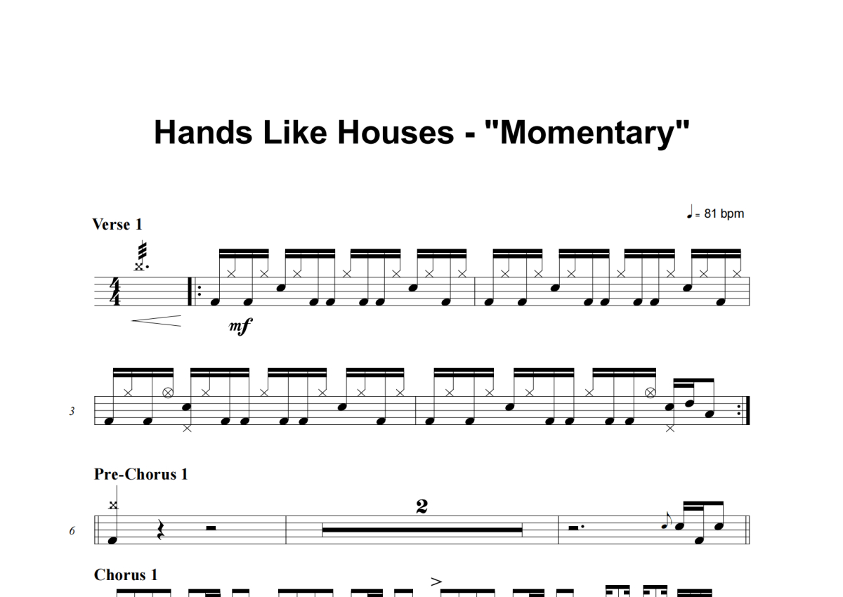《Momentary》是Hands Like Houses演唱的一首歌曲,这份架子鼓谱共有三张高清图谱,图谱由 @积极处世 编配上传,图谱使用五线谱编配,使用这份Momentary架子鼓谱,你将能够轻松地敲打出这首Hands Like Houses的Momentary,快来尝试吧。