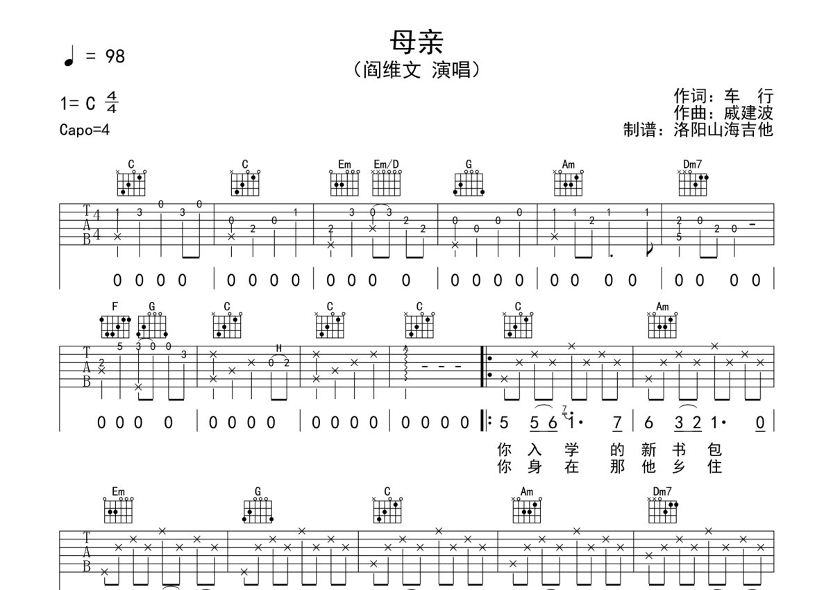 阎维文《母亲》吉他谱 - C调弹唱六线谱