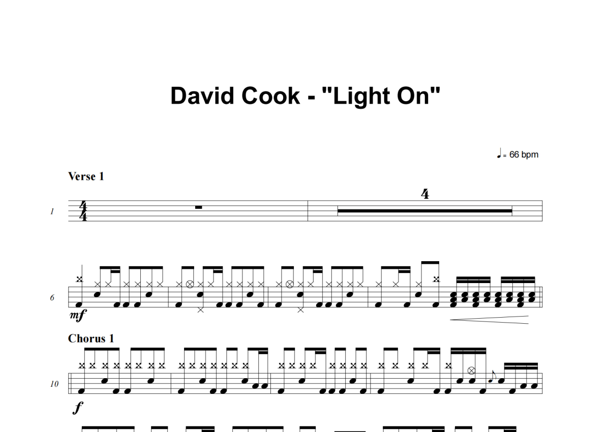 《Light On》是David Cook演唱的一首歌曲,这份架子鼓谱共有三张高清图谱,图谱由 @积极处世 编配上传,图谱使用五线谱编配,使用这份Light On架子鼓谱,你将能够轻松地敲打出这首David Cook的Light On,快来尝试吧。