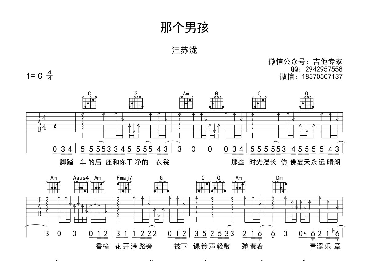 《那个男孩》是汪苏泷演唱的一首歌曲,本吉他谱采用的是C调指法编配,这份吉他谱共有两张高清图谱,图谱由 @吉他专家 编配上传,图谱使用六线谱编配,包含吉他和弦指法、简谱以及歌词部分,使用这份那个男孩吉他谱,可以让你更加方便地掌握这首歌曲的弹唱技巧,快来尝试吧。那个男孩吉他谱,汪苏泷演唱电视剧《夏至未至》插曲,一首关于青春关于成长的歌曲。歌声仿佛带我们重回那个蝉鸣与香樟树影交错的夏天。那个男孩六线谱,C调指法,高清弹唱图片谱。 骑着单车,穿着白衬衣,记忆中的那个男孩,你想起来了吗?那一尘不染的纯真年代,是否也有你青涩而美好的回忆呢?。