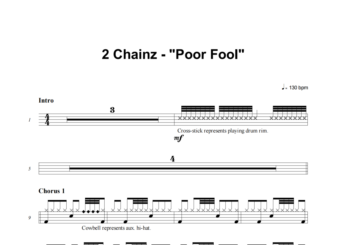 《Poor Fool》是2 Chainz演唱的一首歌曲,这份架子鼓谱共有四张高清图谱,图谱由 @积极处世 编配上传,图谱使用五线谱编配,使用这份Poor Fool架子鼓谱,你将能够轻松地敲打出这首2 Chainz的Poor Fool,快来尝试吧。
