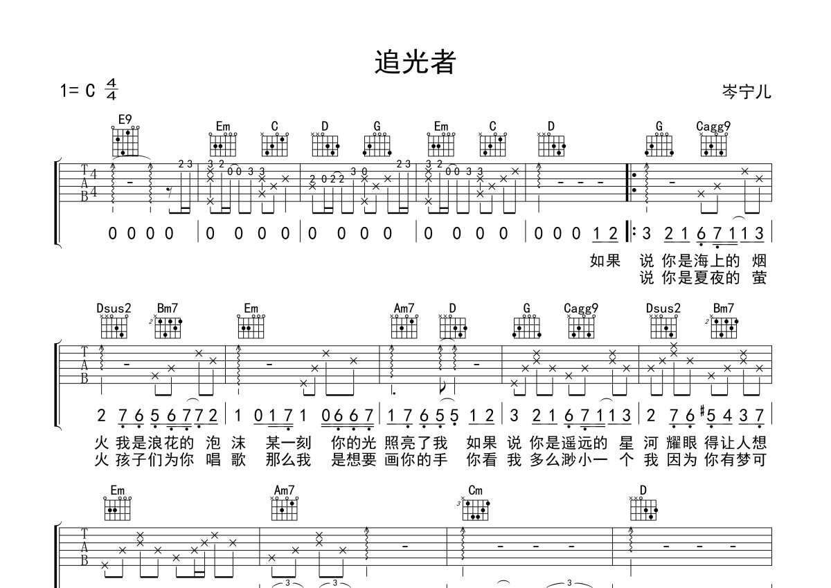 岑宁儿《追光者》吉他谱 - C调弹唱六线谱