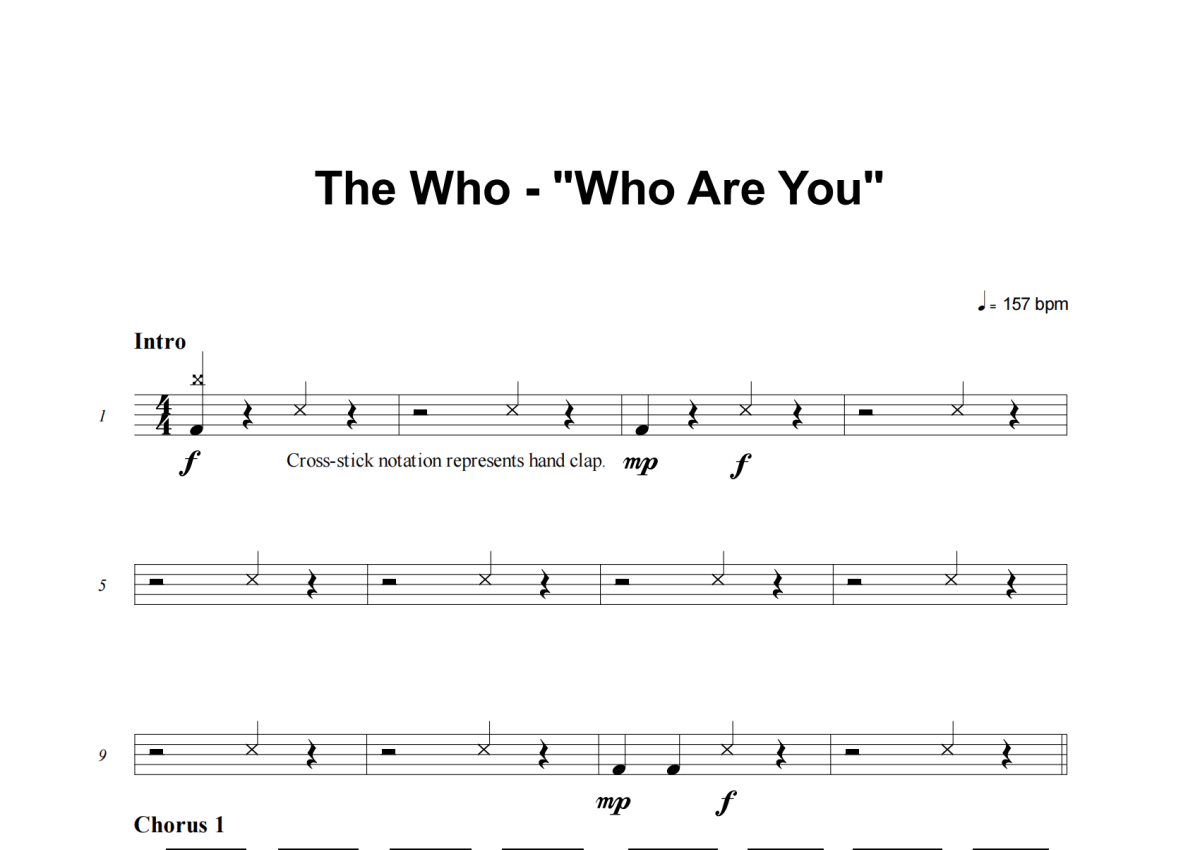 《Who Are You》是The Who演唱的一首歌曲,这份架子鼓谱共有八张高清图谱,图谱由 @积极处世 编配上传,图谱使用五线谱编配,使用这份Who Are You架子鼓谱,你将能够轻松地敲打出这首The Who的Who Are You,快来尝试吧。