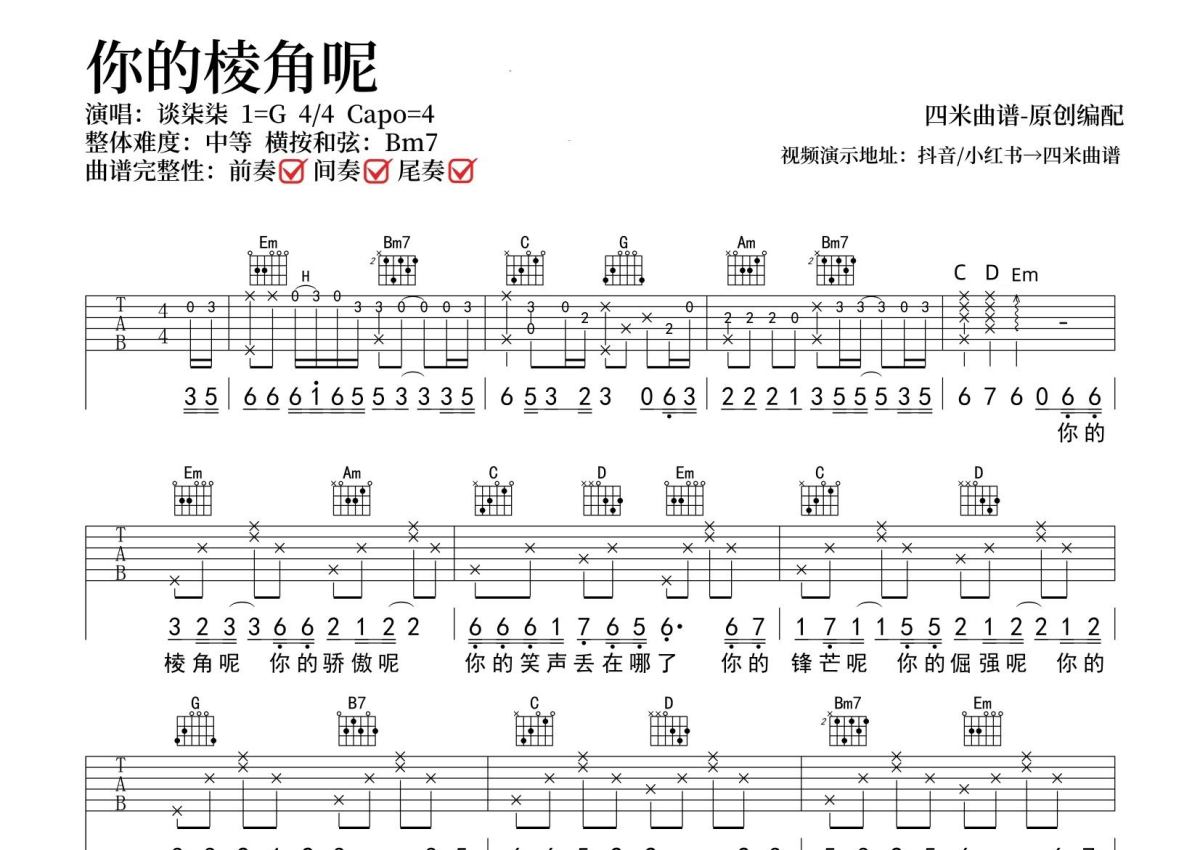 《你的棱角呢》是谈柒柒演唱的一首歌曲,拍号为4/4拍,歌曲原调为B调,但由于原调指法比较难,为了方便弹奏,本吉他谱采用的是B调指法编配,变调夹4品弹奏即为原调,当然也可以根据自己的音域改变变调夹位置,或者通过改变和弦调性,以方便自己弹奏,这份吉他谱共有两张高清图谱,图谱由 @SRV7758521 编配上传,图谱使用六线谱编配,包含吉他和弦指法、简谱以及歌词部分,使用这份你的棱角呢吉他谱,可以让你更加方便地掌握这首歌曲的弹唱技巧,快来尝试吧。