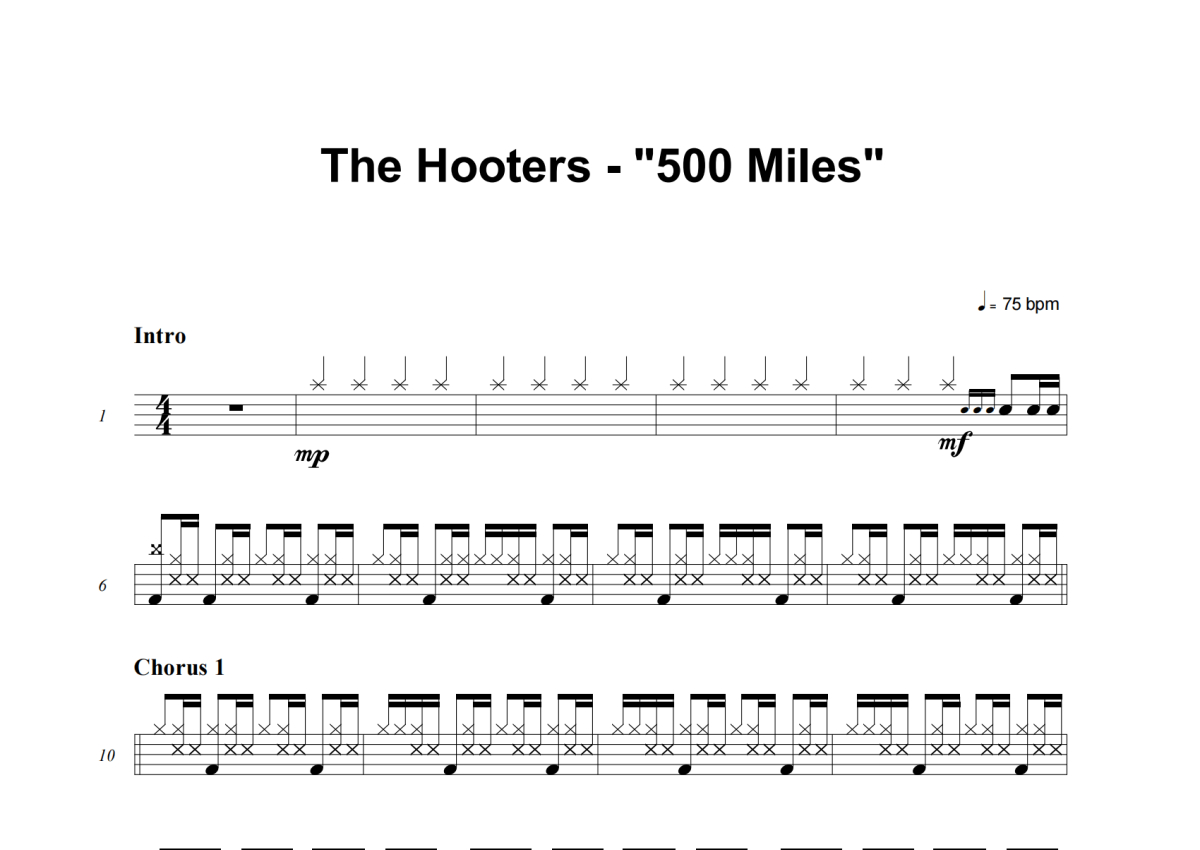 《500 Miles》是The Hooters演唱的一首歌曲,这份架子鼓谱共有三张高清图谱,图谱由 @积极处世 编配上传,图谱使用五线谱编配,使用这份500 Miles架子鼓谱,你将能够轻松地敲打出这首The Hooters的500 Miles,快来尝试吧。