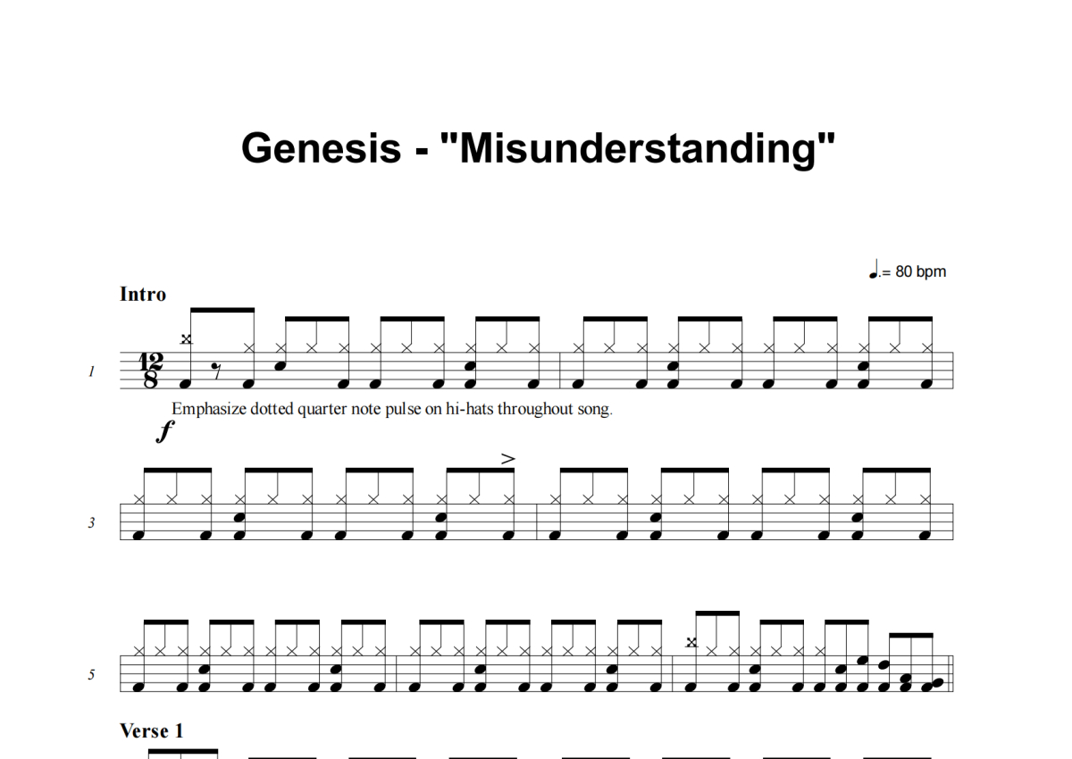 《Misunderstanding》是Genesis演唱的一首歌曲,这份架子鼓谱共有四张高清图谱,图谱由 @积极处世 编配上传,图谱使用五线谱编配,使用这份Misunderstanding架子鼓谱,你将能够轻松地敲打出这首Genesis的Misunderstanding,快来尝试吧。