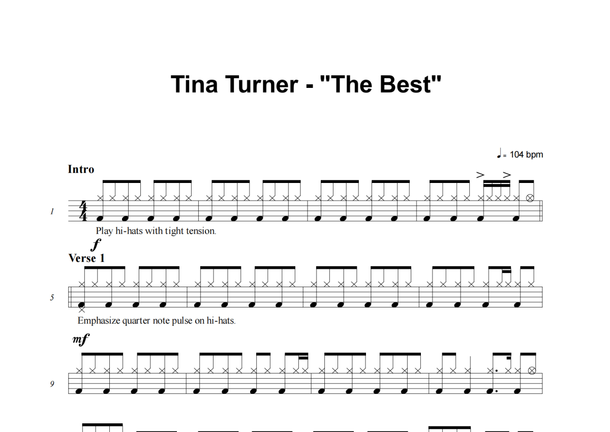 《The Best》是Tina Turner演唱的一首歌曲,这份架子鼓谱共有四张高清图谱,图谱由 @积极处世 编配上传,图谱使用五线谱编配,使用这份The Best架子鼓谱,你将能够轻松地敲打出这首Tina Turner的The Best,快来尝试吧。