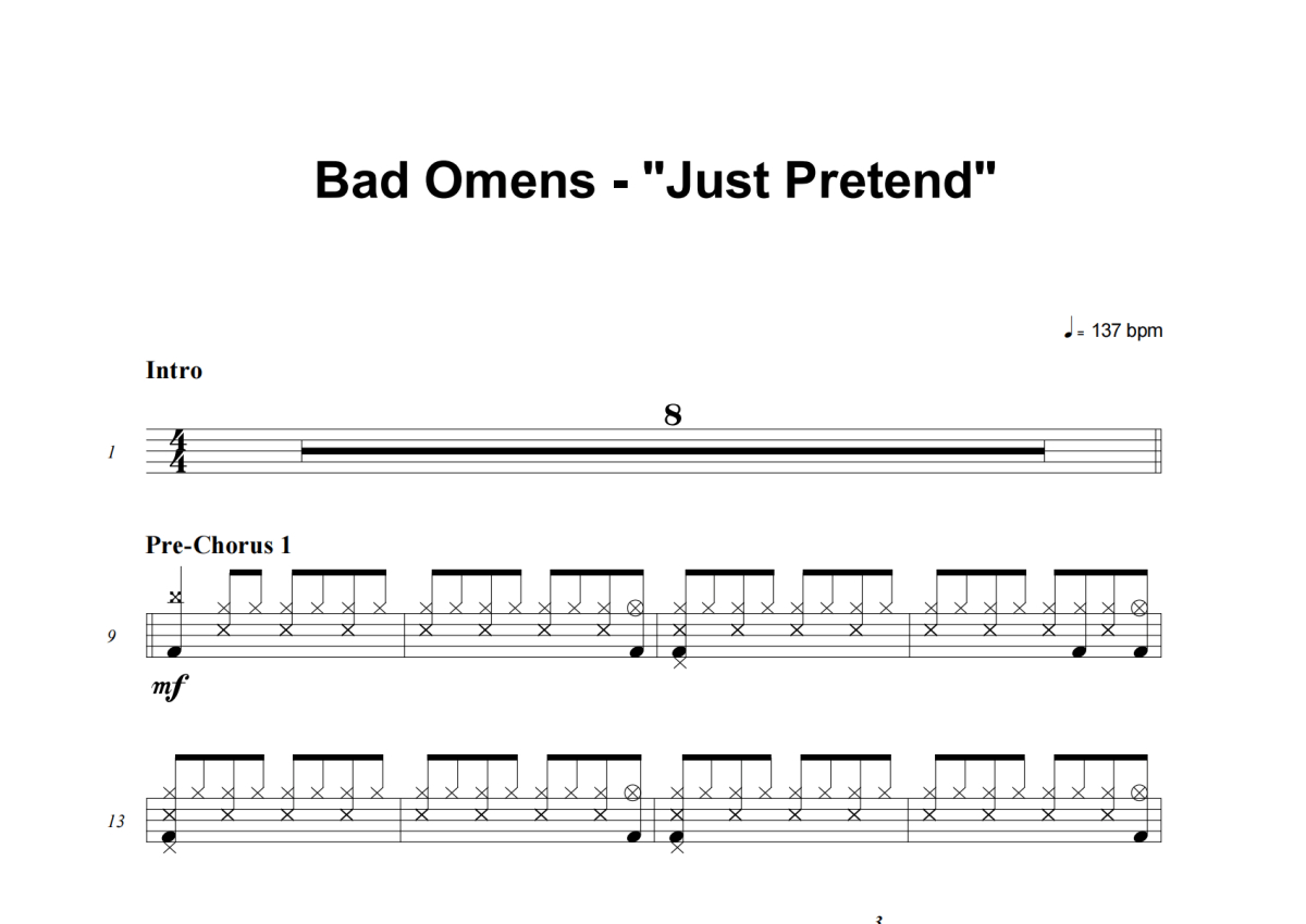 《Just Pretend》是Bad Omens演唱的一首歌曲,这份架子鼓谱共有四张高清图谱,图谱由 @积极处世 编配上传,图谱使用五线谱编配,使用这份Just Pretend架子鼓谱,你将能够轻松地敲打出这首Bad Omens的Just Pretend,快来尝试吧。