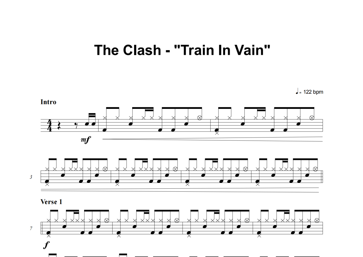 《Train In Vain》是The Clash演唱的一首歌曲,这份架子鼓谱共有四张高清图谱,图谱由 @积极处世 编配上传,图谱使用五线谱编配,使用这份Train In Vain架子鼓谱,你将能够轻松地敲打出这首The Clash的Train In Vain,快来尝试吧。