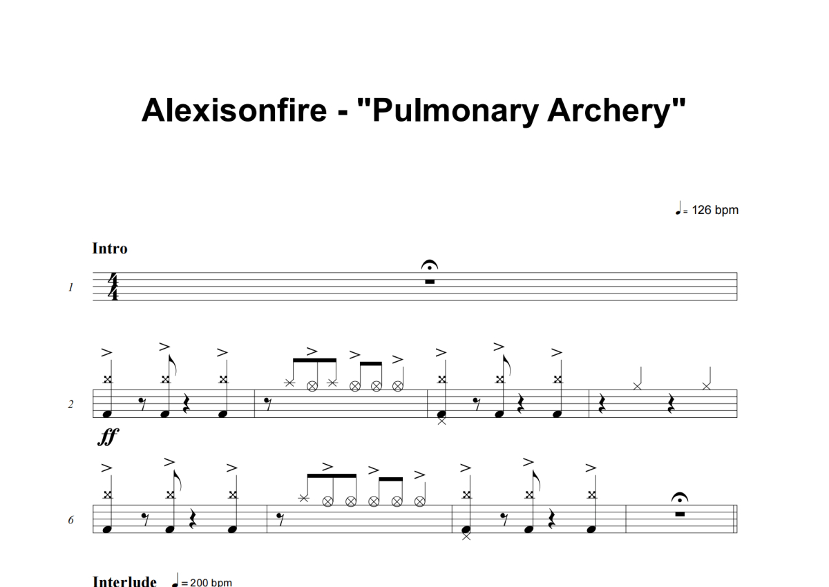《Pulmonary Archery》是Alexisonfire演唱的一首歌曲,这份架子鼓谱共有三张高清图谱,图谱由 @积极处世 编配上传,图谱使用五线谱编配,使用这份Pulmonary Archery架子鼓谱,你将能够轻松地敲打出这首Alexisonfire的Pulmonary Archery,快来尝试吧。