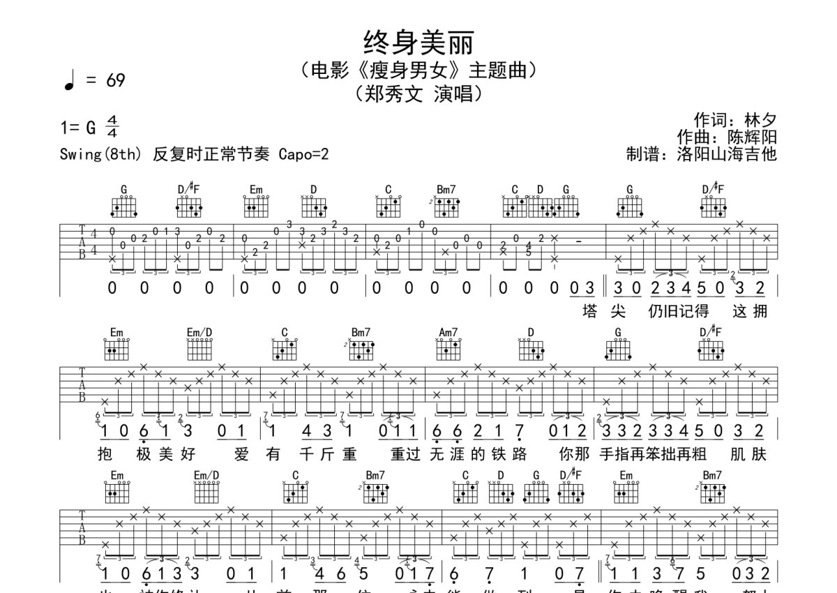 《终身美丽》是郑秀文演唱的一首歌曲,本吉他谱采用的是C调指法编配,这份吉他谱共有两张高清图谱,图谱由 @何奔洋 编配上传,图谱使用六线谱编配,包含吉他和弦指法、简谱以及歌词部分,曲谱配备了相关的音频提供试听,使用这份终身美丽吉他谱,可以让你更加方便地掌握这首歌曲的弹唱技巧,快来尝试吧。