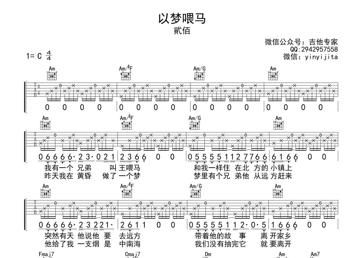 《以梦喂马》是贰佰演唱的一首歌曲,本吉他谱采用的是C调指法编配,这份吉他谱共有两张高清图谱,图谱由 @吉他专家 编配上传,图谱使用六线谱编配,包含吉他和弦指法、简谱以及歌词部分,使用这份以梦喂马吉他谱,可以让你更加方便地掌握这首歌曲的弹唱技巧,快来尝试吧。原调降E,CAPO夹三品,选用C调,贰佰一首原创民谣歌曲, 贰佰的歌曲,是真正有烟有酒有故事的民谣。和你们一样,我也出生在一个不为人知的小城镇,我也和你们一样,想要义无反顾的离开这里,是为了自由还是为了理想的生活,和你们一样,我们都背井离乡,可是,欲望越大,痛苦也越大。有些苦楚,似乎也不能够轻易示人,那就埋进肚子里,可是,梦还是要做下去,因为终有一天,我们会在梦里醒来。