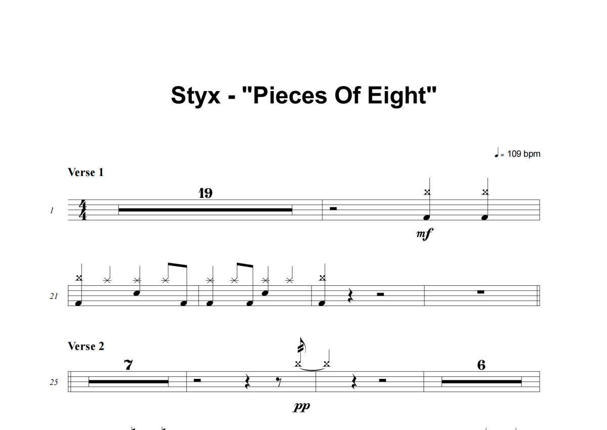 《Pieces Of Eight》是Styx演唱的一首歌曲,这份架子鼓谱共有四张高清图谱,图谱由 @积极处世 编配上传,图谱使用五线谱编配,使用这份Pieces Of Eight架子鼓谱,你将能够轻松地敲打出这首Styx的Pieces Of Eight,快来尝试吧。