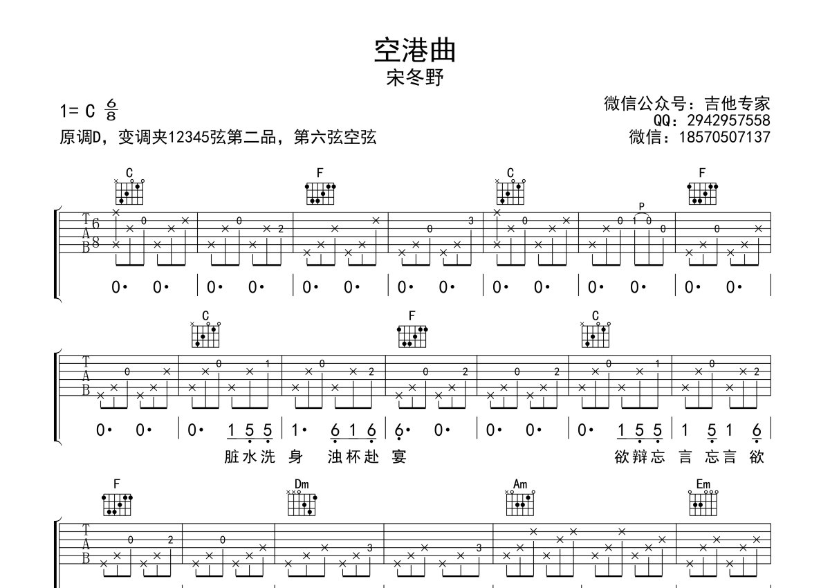 《空港曲》是宋冬野演唱的一首歌曲,本吉他谱采用的是C调指法编配,这份吉他谱共有两张高清图谱,图谱由 @吉他专家 编配上传,图谱使用六线谱编配,包含吉他和弦指法、简谱以及歌词部分,使用这份空港曲吉他谱,可以让你更加方便地掌握这首歌曲的弹唱技巧,快来尝试吧。宋冬野《空港曲》吉他谱,C调指法编配,空港曲六线谱。宋冬野民谣创作的分水岭作品,伴随着悠扬的曲调以及意蕴深远的唱词,听歌的人不但听见了宋冬野的内心,似乎,也听见了自己心底的声音。