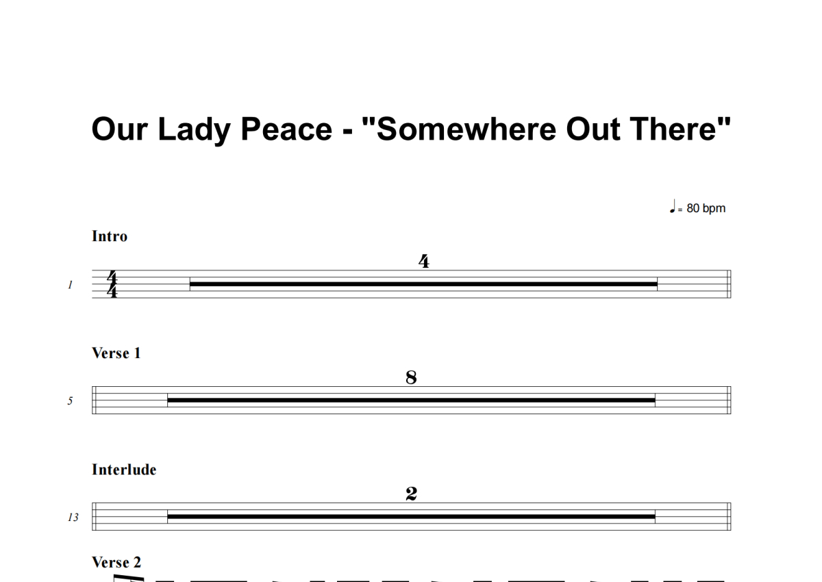 《Somewhere Out There》是Our Lady Peace演唱的一首歌曲,这份架子鼓谱共有三张高清图谱,图谱由 @积极处世 编配上传,图谱使用五线谱编配,使用这份Somewhere Out There架子鼓谱,你将能够轻松地敲打出这首Our Lady Peace的Somewhere Out There,快来尝试吧。