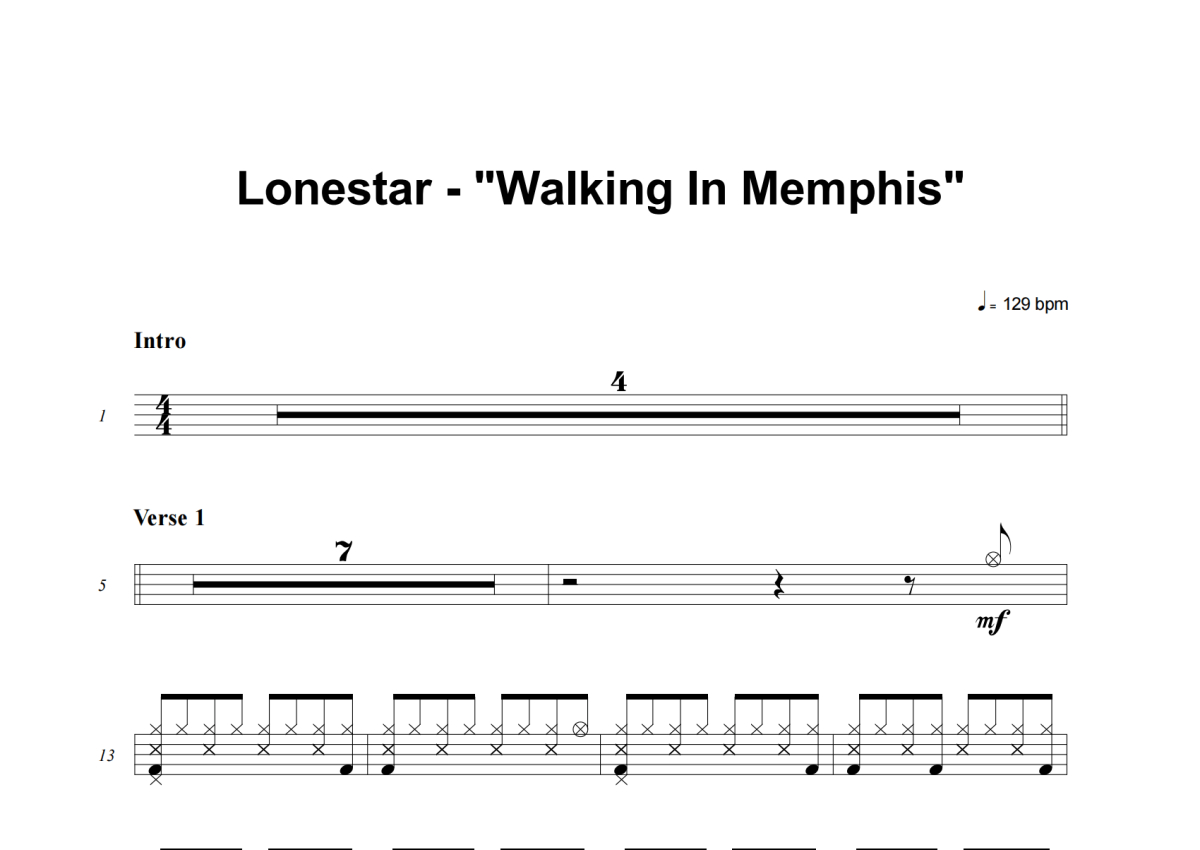 《Walking In Memphis》是Lonestar演唱的一首歌曲,这份架子鼓谱共有四张高清图谱,图谱由 @积极处世 编配上传,图谱使用五线谱编配,使用这份Walking In Memphis架子鼓谱,你将能够轻松地敲打出这首Lonestar的Walking In Memphis,快来尝试吧。