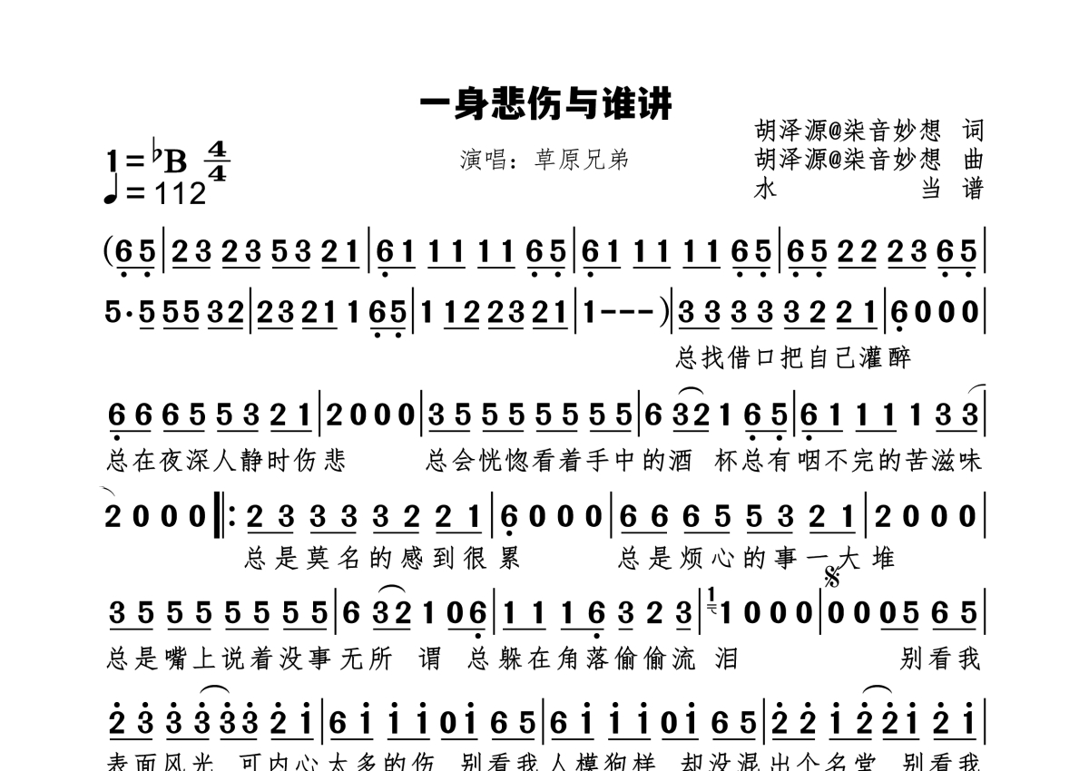 《一身悲伤与谁讲》是草原兄弟演唱的一首歌曲,这份简谱共有一张高清图谱,图谱由 @水当 编配上传原调bB。