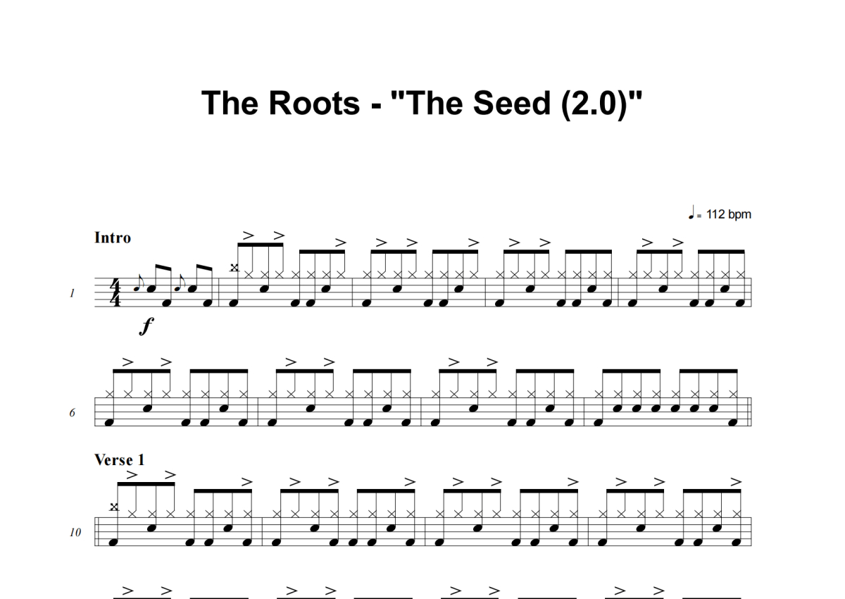 《The Seed (2.0)》是The Roots演唱的一首歌曲,这份架子鼓谱共有四张高清图谱,图谱由 @积极处世 编配上传,图谱使用五线谱编配,使用这份The Seed (2.0)架子鼓谱,你将能够轻松地敲打出这首The Roots的The Seed (2.0),快来尝试吧。