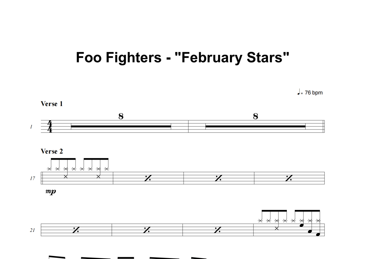 《February Stars》是Foo Fighters演唱的一首歌曲,这份架子鼓谱共有三张高清图谱,图谱由 @积极处世 编配上传,图谱使用五线谱编配,使用这份February Stars架子鼓谱,你将能够轻松地敲打出这首Foo Fighters的February Stars,快来尝试吧。