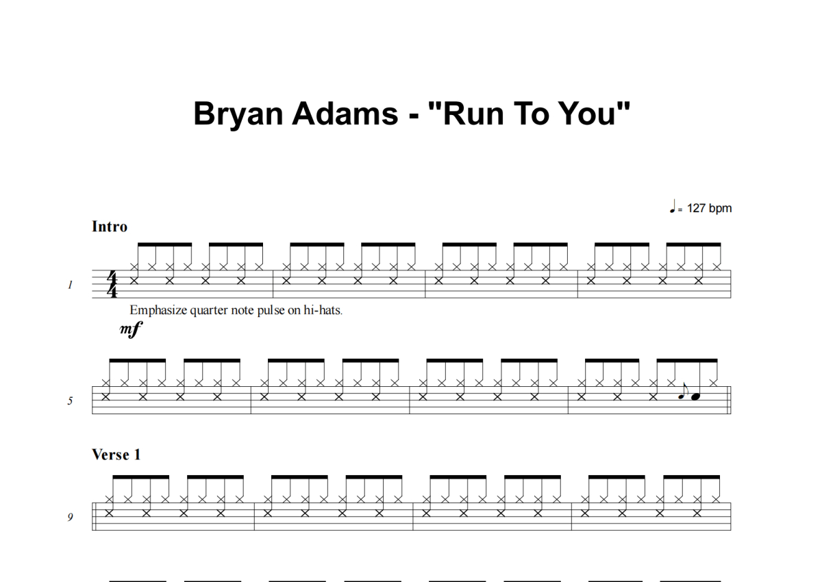 《Run To You》是Bryan Adams演唱的一首歌曲,这份架子鼓谱共有四张高清图谱,图谱由 @失眠的土豆 编配上传,图谱使用五线谱编配,使用这份Run To You架子鼓谱,你将能够轻松地敲打出这首Bryan Adams的Run To You,快来尝试吧。