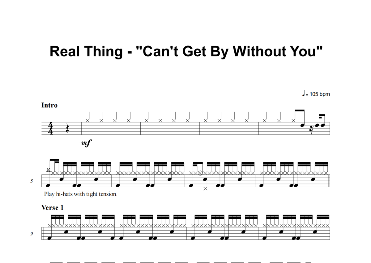 《Can't Get By Without You》是The Real Thing演唱的一首歌曲,这份架子鼓谱共有三张高清图谱,图谱由 @失眠的土豆 编配上传,图谱使用五线谱编配,使用这份Can't Get By Without You架子鼓谱,你将能够轻松地敲打出这首The Real Thing的Can't Get By Without You,快来尝试吧。