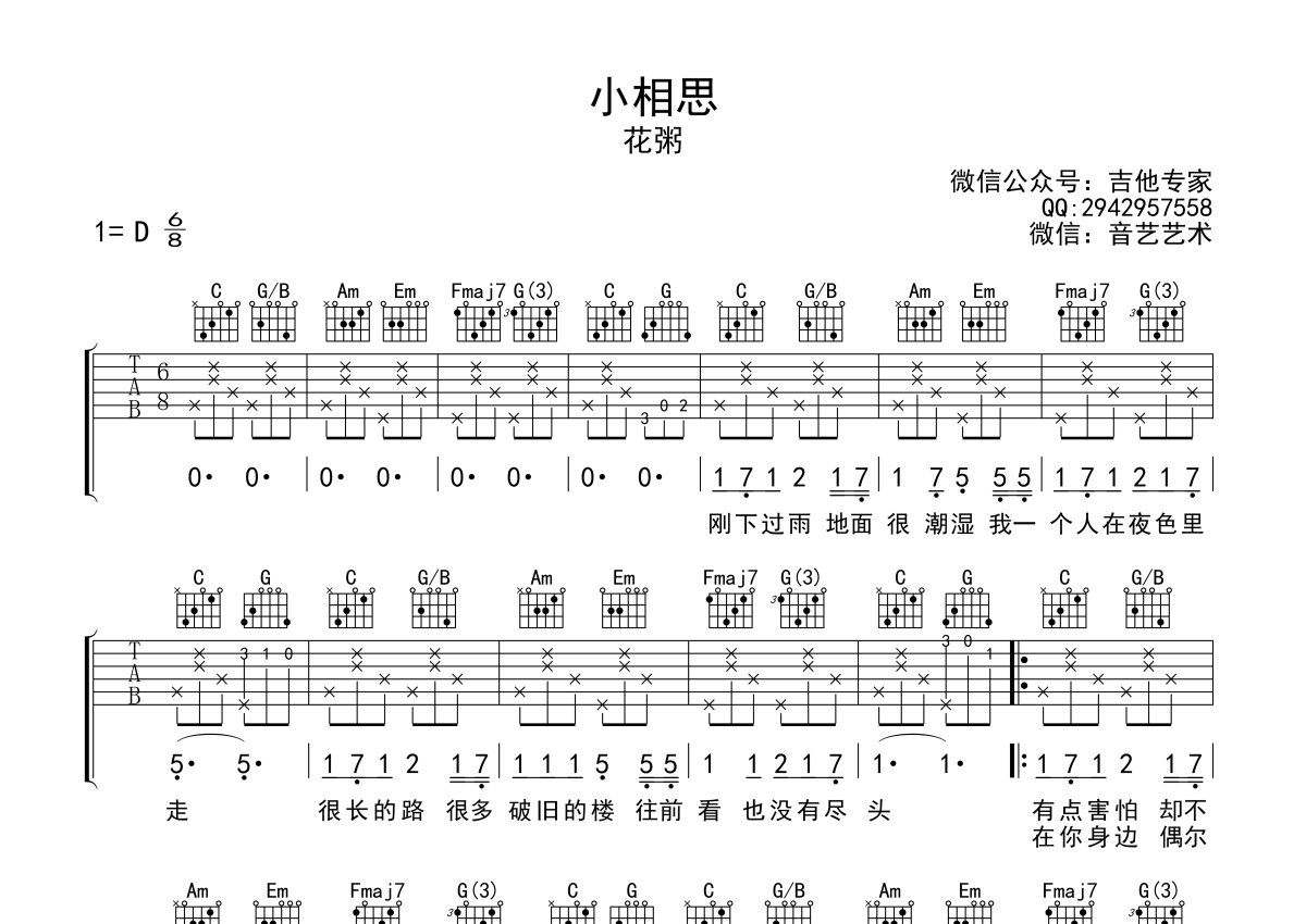 《小相思》是花粥演唱的一首歌曲,本吉他谱采用的是C调指法编配,这份吉他谱共有两张高清图谱,图谱由 @吉他专家 编配上传,图谱使用六线谱编配,包含吉他和弦指法、简谱以及歌词部分,使用这份小相思吉他谱,可以让你更加方便地掌握这首歌曲的弹唱技巧,快来尝试吧。原调#C选调C,变调夹夹一品,花粥的一首清新温柔的小情歌,喜欢这样的淡淡的,干净的恋爱,让整个城市变得明丽。