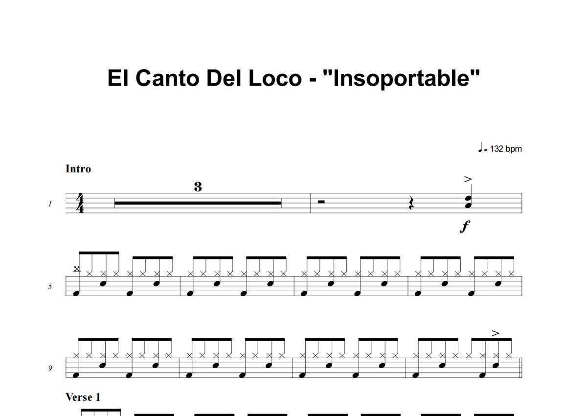 《Insoportable》是El Canto Del Loco演唱的一首歌曲,这份架子鼓谱共有四张高清图谱,图谱由 @失眠的土豆 编配上传,图谱使用五线谱编配,使用这份Insoportable架子鼓谱,你将能够轻松地敲打出这首El Canto Del Loco的Insoportable,快来尝试吧。