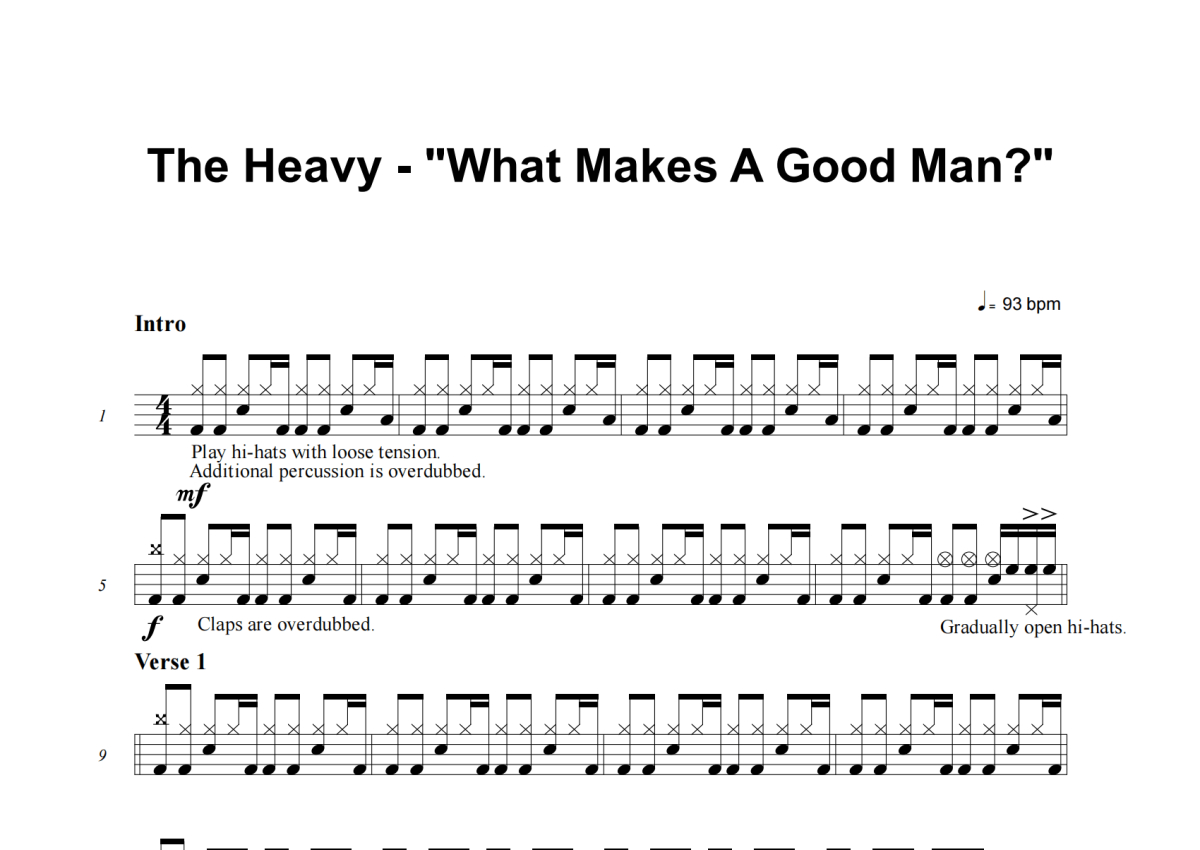 《What Makes A Good Man》是The Heavy演唱的一首歌曲,这份架子鼓谱共有三张高清图谱,图谱由 @失眠的土豆 编配上传,图谱使用五线谱编配,使用这份What Makes A Good Man架子鼓谱,你将能够轻松地敲打出这首The Heavy的What Makes A Good Man,快来尝试吧。