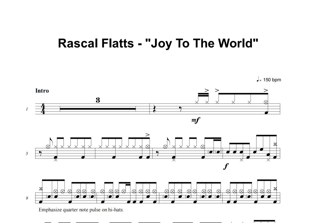 《Joy To The World》是Rascal Flatts演唱的一首歌曲,这份架子鼓谱共有四张高清图谱,图谱由 @失眠的土豆 编配上传,图谱使用五线谱编配,使用这份Joy To The World架子鼓谱,你将能够轻松地敲打出这首Rascal Flatts的Joy To The World,快来尝试吧。