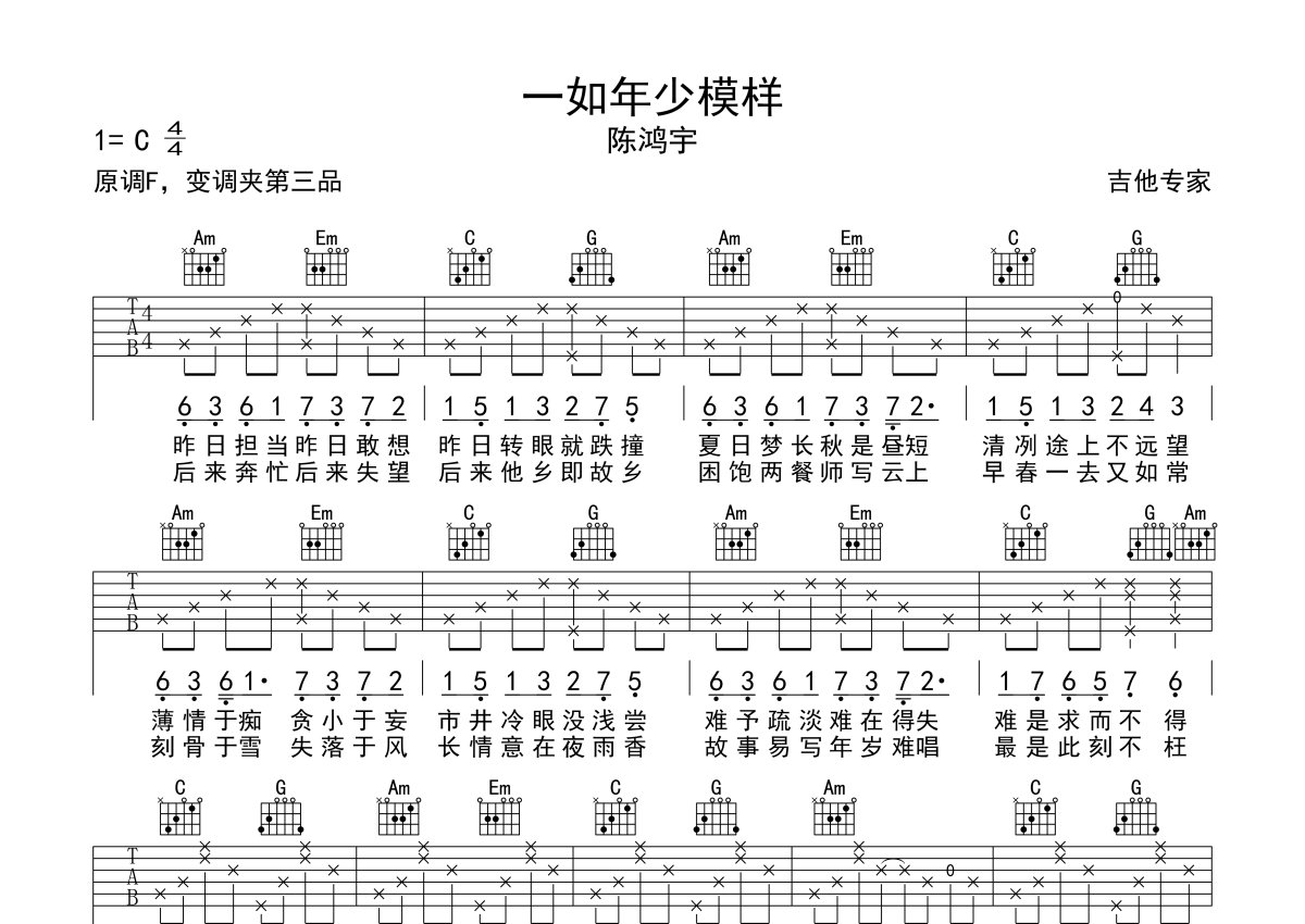 陈鸿宇《一如年少模样》吉他谱 - C调弹唱六线谱