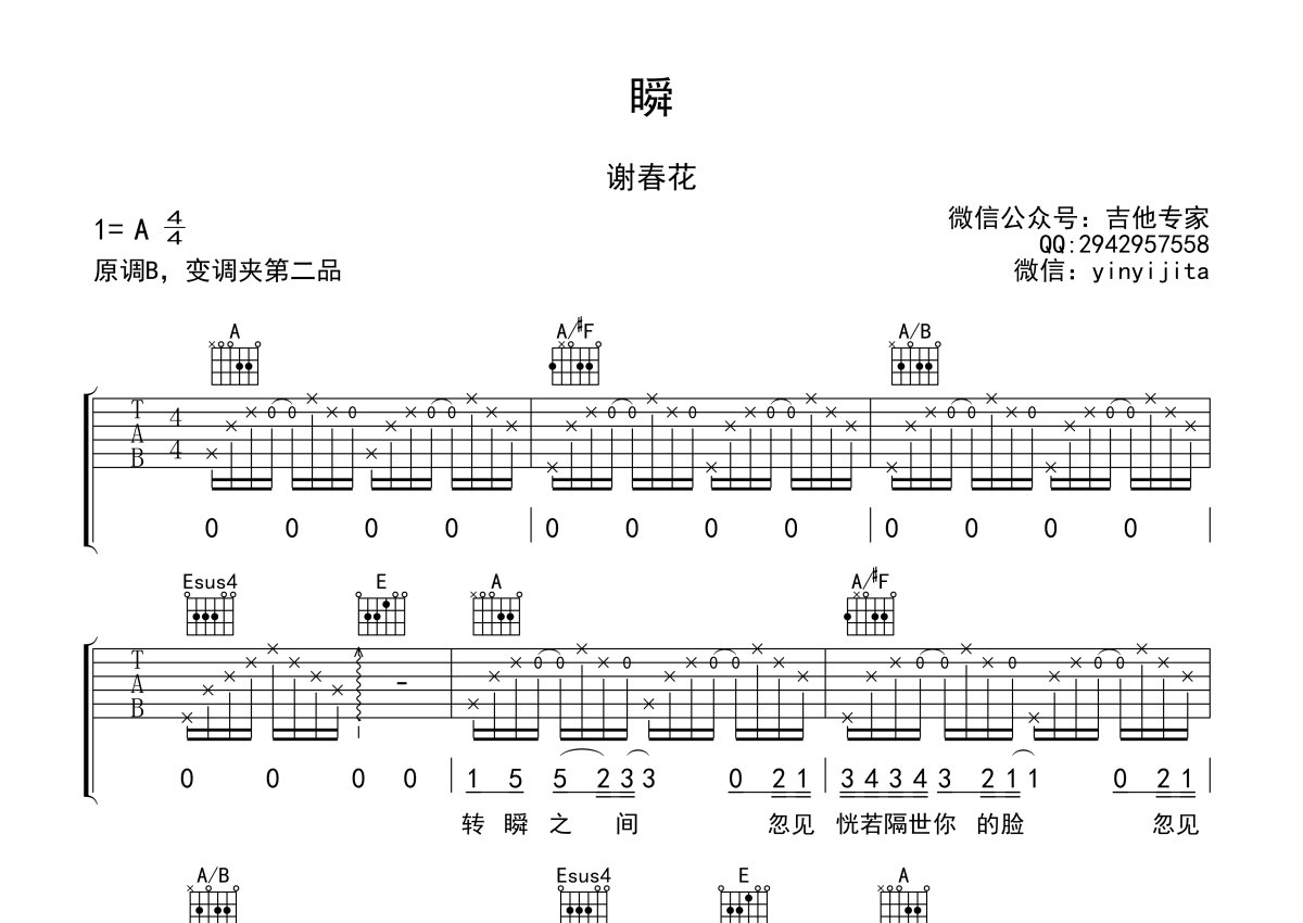 《瞬》是谢春花演唱的一首歌曲,本吉他谱采用的是C调指法编配,这份吉他谱共有两张高清图谱,图谱由 @吉他专家 编配上传,图谱使用六线谱编配,包含吉他和弦指法、简谱以及歌词部分,使用这份瞬吉他谱,可以让你更加方便地掌握这首歌曲的弹唱技巧,快来尝试吧。瞬吉他谱,谢春花词曲创作演唱的一首民谣歌曲。C调指法编配,变调夹夹第二品,谢春花的一首《瞬》唱出了那种轻柔而又彻骨的自由,随意随性的唱腔加上简洁简单的吉他伴奏,给人一种洒脱的勇气。