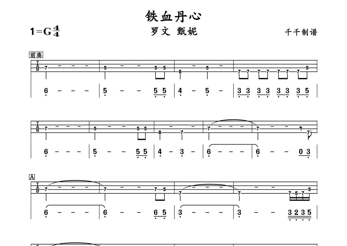 《铁血丹心》是罗文演唱的一首歌曲,贝斯谱,拍号为4/4拍,歌曲原调为G调,演奏时不需要使用变调夹即为原调,这份电吉他谱共有两张高清图谱,图谱由 @千千 编配上传,图谱使用六线谱编配,使用这份铁血丹心电吉他谱,可以让你更加方便地掌握这首歌曲的演奏技巧,快来尝试吧。