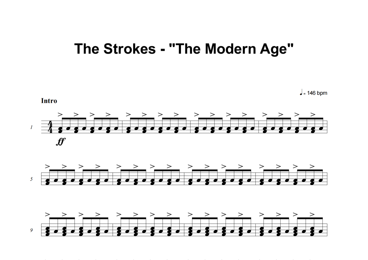 《The Modern Age》是The Strokes演唱的一首歌曲,这份架子鼓谱共有四张高清图谱,图谱由 @失眠的土豆 编配上传,图谱使用五线谱编配,使用这份The Modern Age架子鼓谱,你将能够轻松地敲打出这首The Strokes的The Modern Age,快来尝试吧。