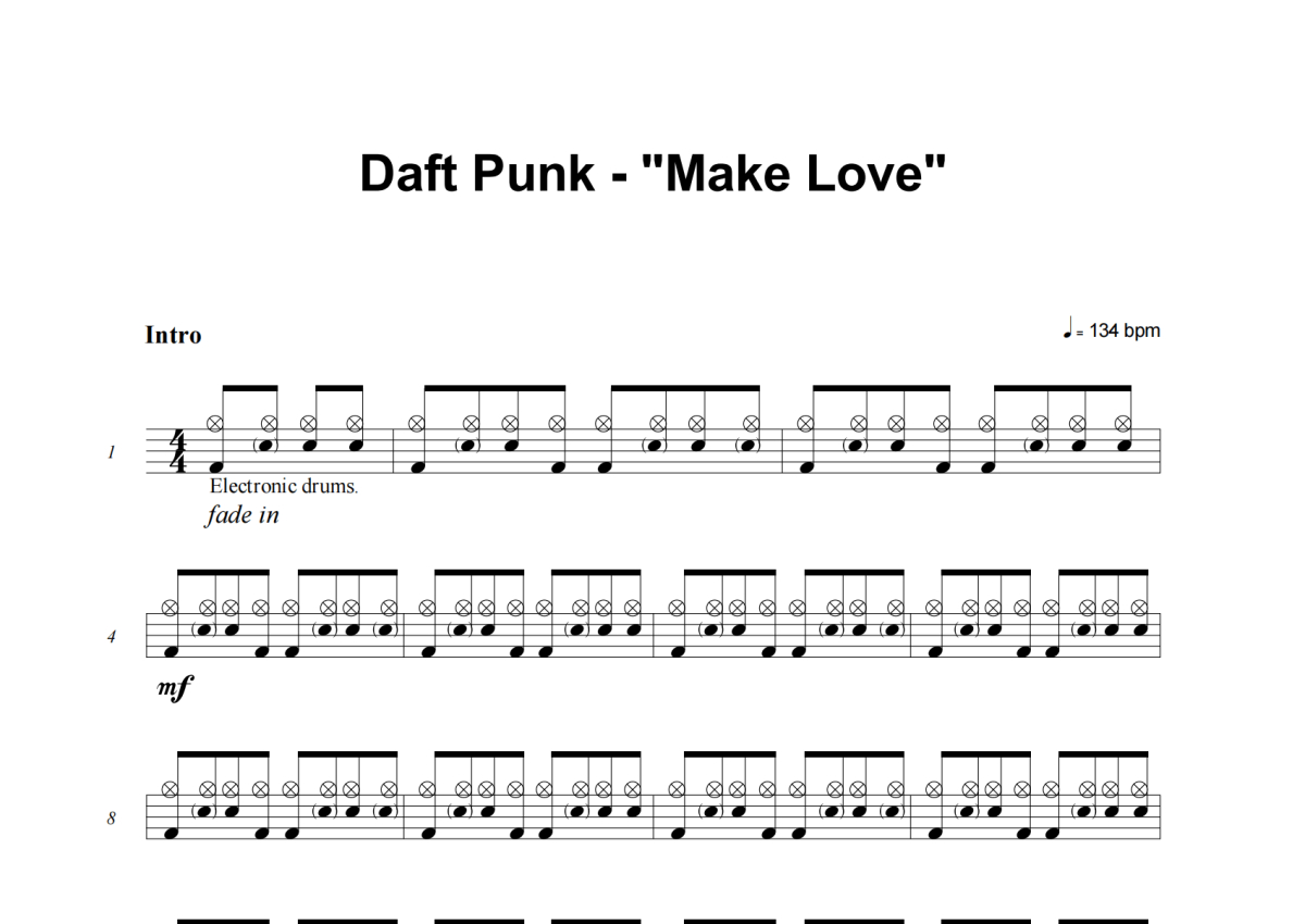 《Make Love》是Daft Punk演唱的一首歌曲,这份架子鼓谱共有五张高清图谱,图谱由 @失眠的土豆 编配上传,图谱使用五线谱编配,使用这份Make Love架子鼓谱,你将能够轻松地敲打出这首Daft Punk的Make Love,快来尝试吧。