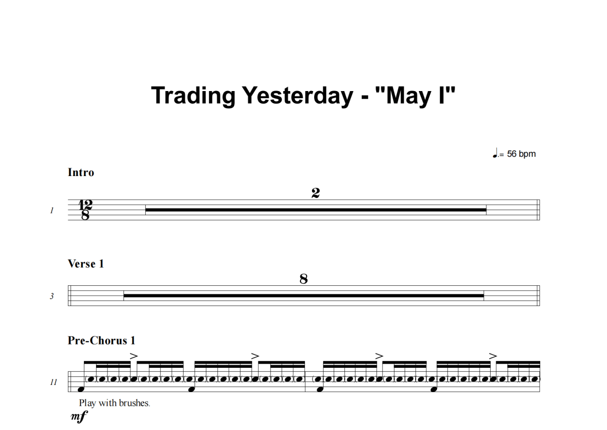 《May I》是Trading Yesterday演唱的一首歌曲,这份架子鼓谱共有四张高清图谱,图谱由 @失眠的土豆 编配上传,图谱使用五线谱编配,使用这份May I架子鼓谱,你将能够轻松地敲打出这首Trading Yesterday的May I,快来尝试吧。
