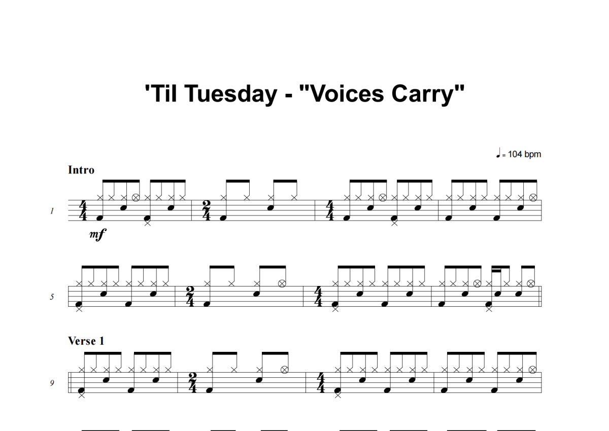 《Voices Carry》是Til Tuesday演唱的一首歌曲,这份架子鼓谱共有四张高清图谱,图谱由 @失眠的土豆 编配上传,图谱使用五线谱编配,使用这份Voices Carry架子鼓谱,你将能够轻松地敲打出这首Til Tuesday的Voices Carry,快来尝试吧。