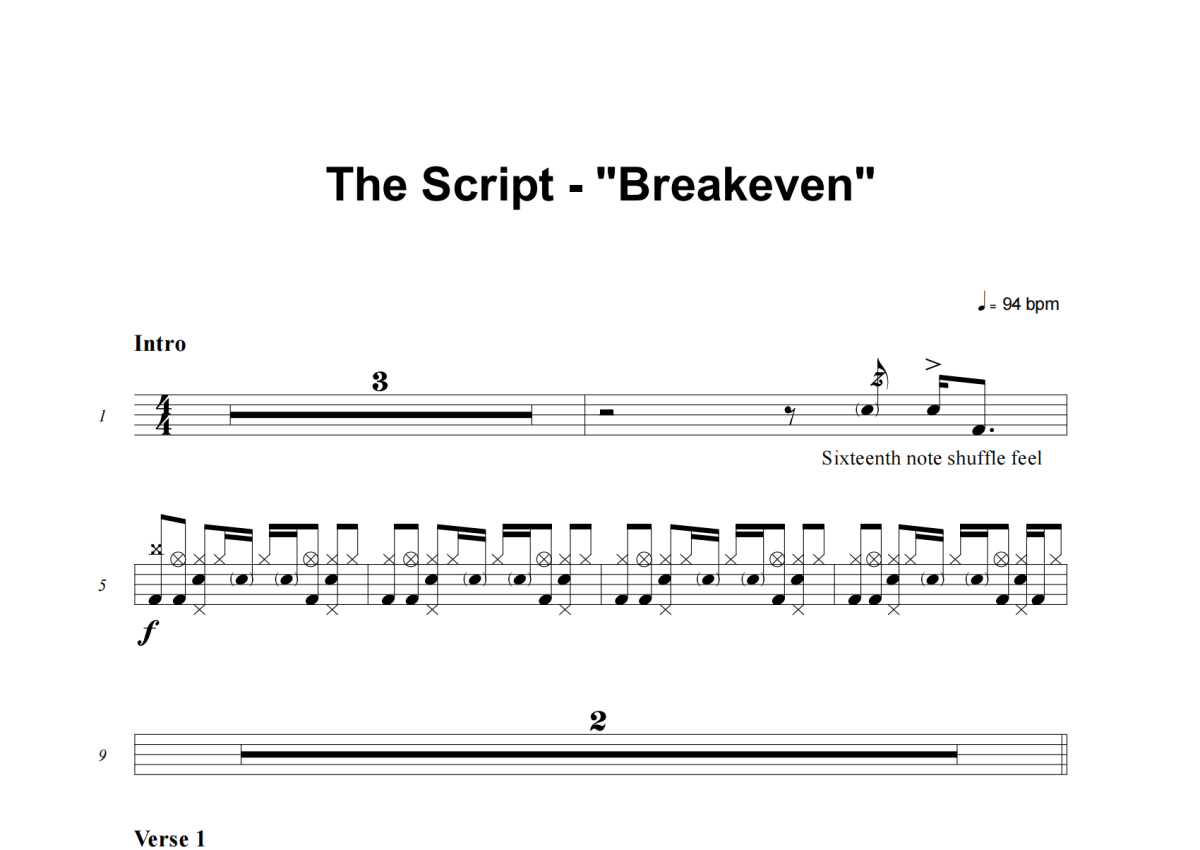 《Breakeven》是The Script演唱的一首歌曲,这份架子鼓谱共有三张高清图谱,图谱由 @失眠的土豆 编配上传,图谱使用五线谱编配,使用这份Breakeven架子鼓谱,你将能够轻松地敲打出这首The Script的Breakeven,快来尝试吧。