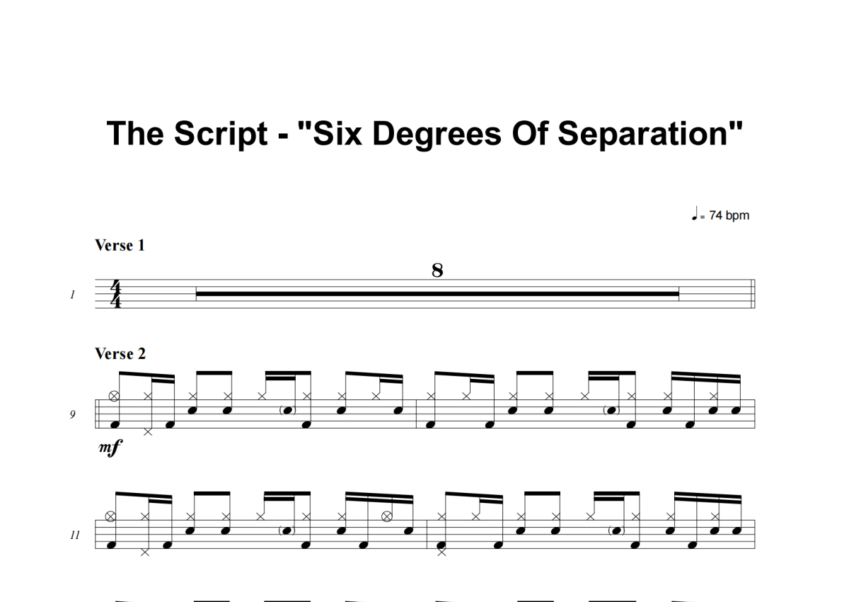 《Six Degrees Of Separation》是The Script演唱的一首歌曲,这份架子鼓谱共有四张高清图谱,图谱由 @失眠的土豆 编配上传,图谱使用五线谱编配,使用这份Six Degrees Of Separation架子鼓谱,你将能够轻松地敲打出这首The Script的Six Degrees Of Separation,快来尝试吧。