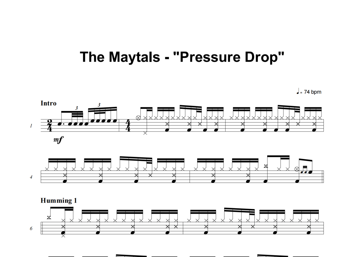 《Pressure Drop》是The Maytals演唱的一首歌曲,这份架子鼓谱共有四张高清图谱,图谱由 @失眠的土豆 编配上传,图谱使用五线谱编配,使用这份Pressure Drop架子鼓谱,你将能够轻松地敲打出这首The Maytals的Pressure Drop,快来尝试吧。
