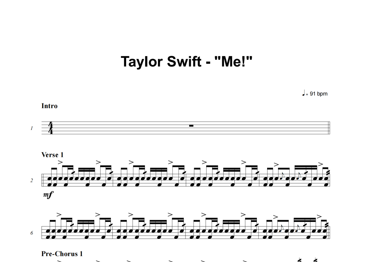 《Me!》是Taylor Swift演唱的一首歌曲,这份架子鼓谱共有四张高清图谱,图谱由 @失眠的土豆 编配上传,图谱使用五线谱编配,使用这份Me!架子鼓谱,你将能够轻松地敲打出这首Taylor Swift的Me!,快来尝试吧。