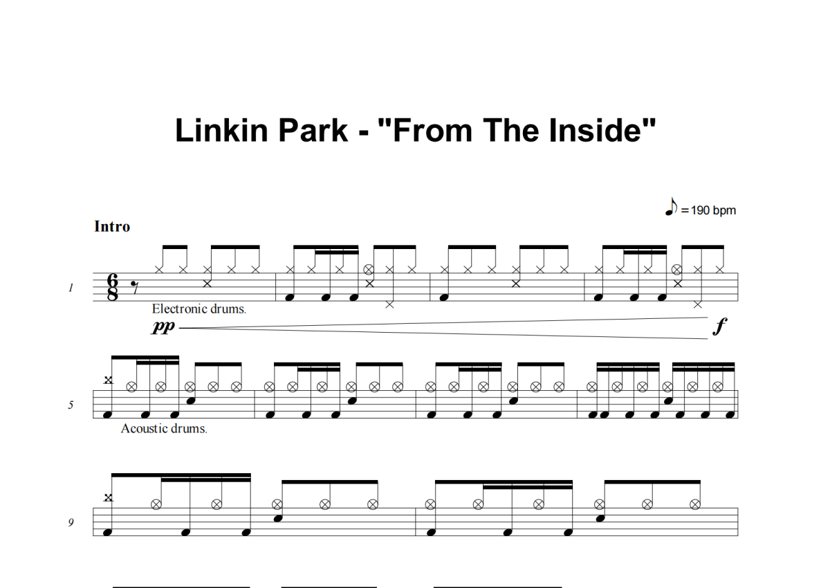 《From The Inside》是Linkin Park演唱的一首歌曲,这份架子鼓谱共有四张高清图谱,图谱由 @失眠的土豆 编配上传,图谱使用五线谱编配,使用这份From The Inside架子鼓谱,你将能够轻松地敲打出这首Linkin Park的From The Inside,快来尝试吧。