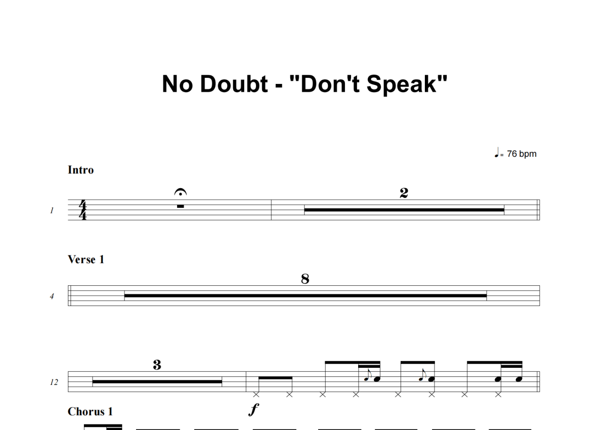 《Don't Speak》是No Doubt演唱的一首歌曲,这份架子鼓谱共有五张高清图谱,图谱由 @失眠的土豆 编配上传,图谱使用五线谱编配,使用这份Don't Speak架子鼓谱,你将能够轻松地敲打出这首No Doubt的Don't Speak,快来尝试吧。
